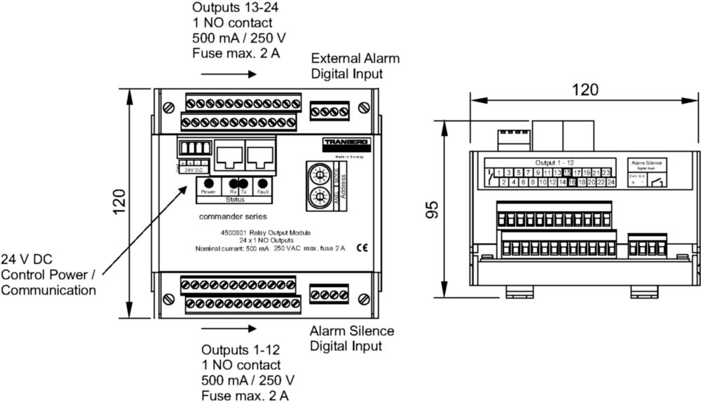 | Highlights | DIN rail mounting.24 individual potential free outputs, 1 N/O contacts.Built-in snubber network which allows termination of a wide range of communication cable, 100-250 Ohm characteristic impedance. End resistors shall not be used.Alarm input: 24VDC opto-isolated, and volt-free contacts.Alarm reset input: 24VDC opto-isolated, and volt free contacts. |