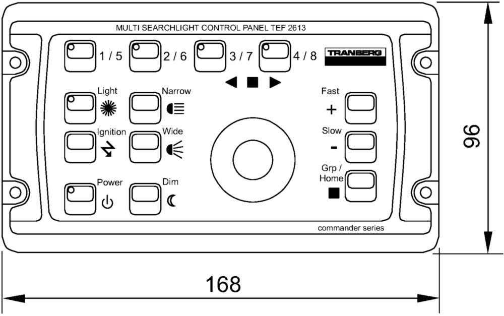 TEF 2613 is a control panel for searchlights. With one panel you can control up to 8 searchlights. This means that the need of space on the bridge desk is considerably reduced, but still the user-friendliness is high. This panel can only be used together with searchlights which are adapted to this kind of technology. The searchlights and the control panels are connected to a common RS-485 network, which reduce the wiring on the vessel to a minimum. APPLICATION: For flush mounting. For control of up to 8 searchlights. Up to 16 panels may be connected to the network May be used with any kind of light source. TEF 2618 radio control interface may be connected to the network |